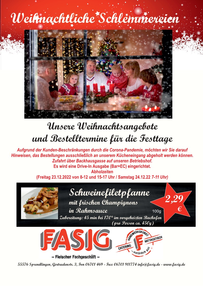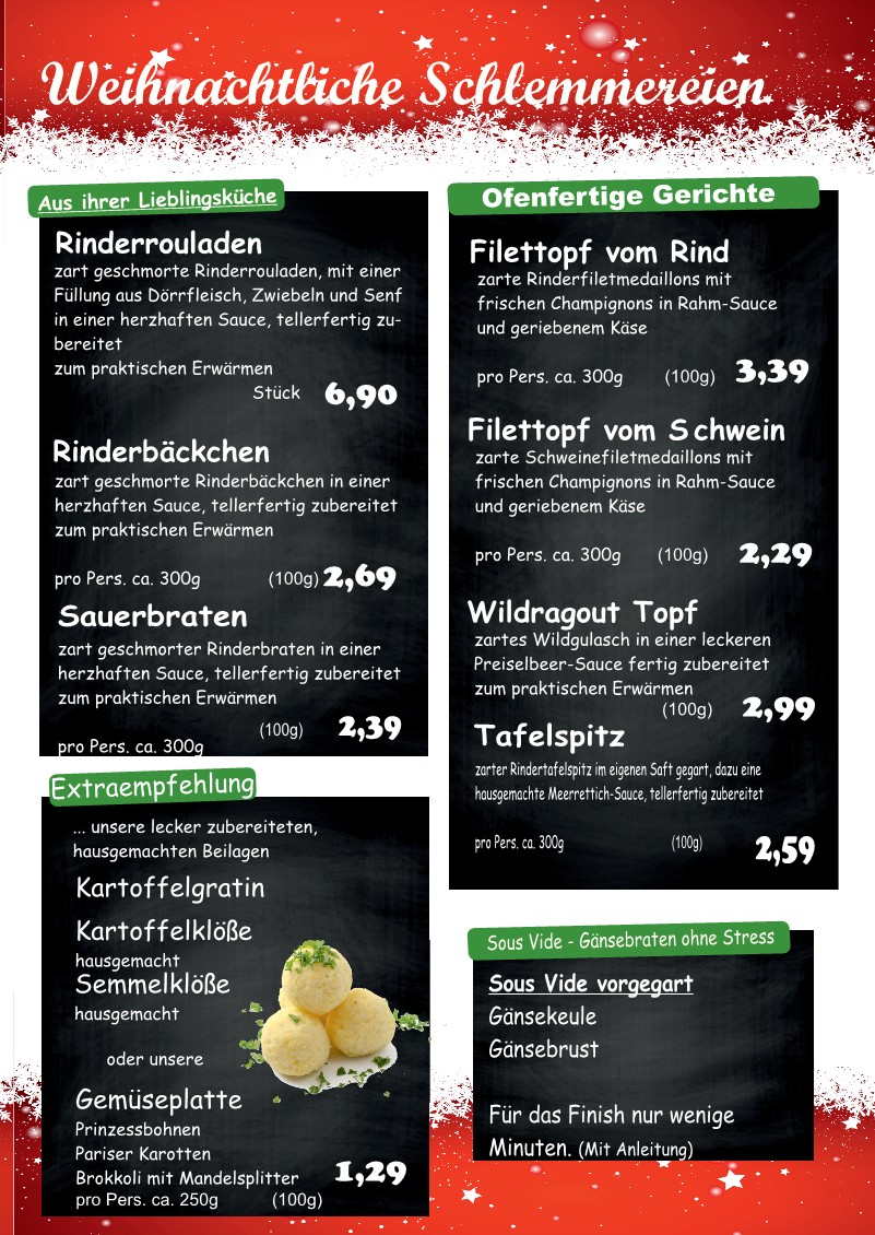 Auch wenn es nur noch wenige Wochen sind! Planen Sie jetzt in aller Ruhe Ihr Essen für die Feiertage – wir beraten Sie gerne! Nutzen Sie einfach unseren Bestellzettel und Weihnachten wird ein Genuss!