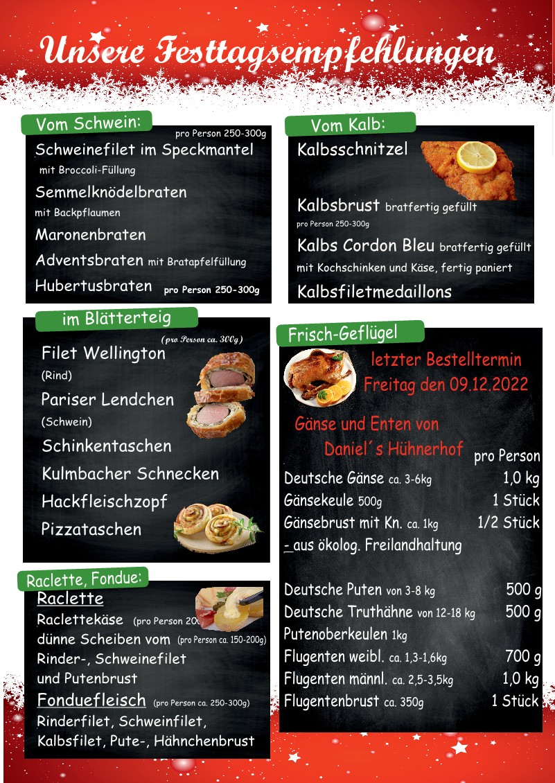 Auch wenn es nur noch wenige Wochen sind! Planen Sie jetzt in aller Ruhe Ihr Essen für die Feiertage – wir beraten Sie gerne! Nutzen Sie einfach unseren Bestellzettel und Weihnachten wird ein Genuss!